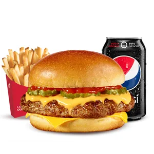 Hamburguesa Con 1 Carne De 4 Oz (114G), Queso Cheddar, Salsa De Queso, Mix de Pimentones y Cebolla Grillada, Papa Mediana, Bebida Lata