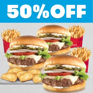 3 Hamburguesas Deluxe Mozzarella, 3 Papas Fritas Regulares, 6 Empanadas